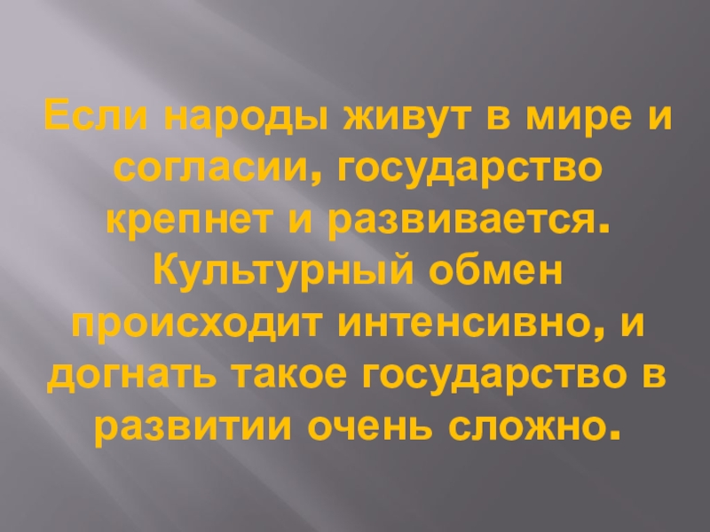 Если народы живут в мире и согласии, государство крепнет и развивается. Культурный обмен происходит интенсивно, и догнать