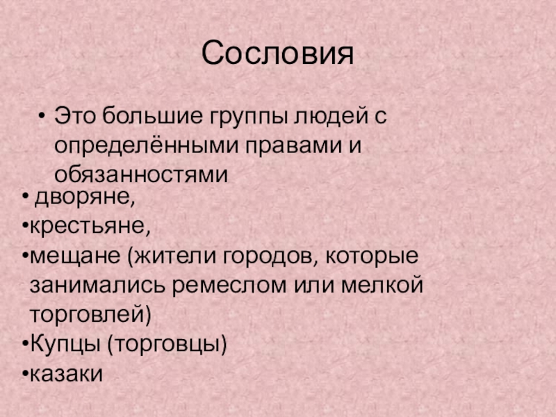 Сословия Это большие группы людей с определёнными правами и обязанностями дворяне, крестьяне, мещане (жители городов, которые занимались