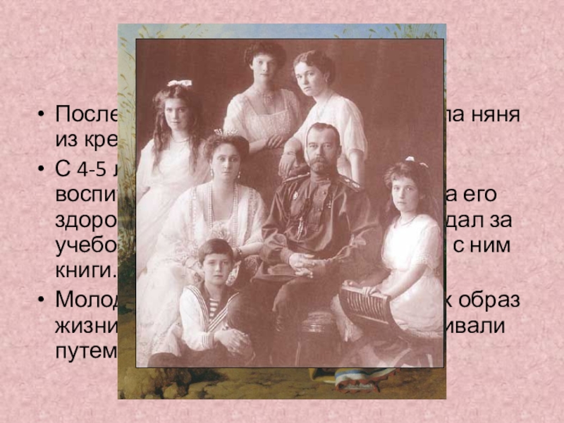 мальчики воспитывались у воспитателя-гувернера. Он следил за его здоровьем и внешним видом, наблюдал за учебой, помогал делать уроки, читал с ним книги.