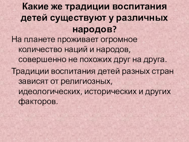 Традиции воспитания детей разных стран зависят от религиозных, идеологических, исторических и других факторов.