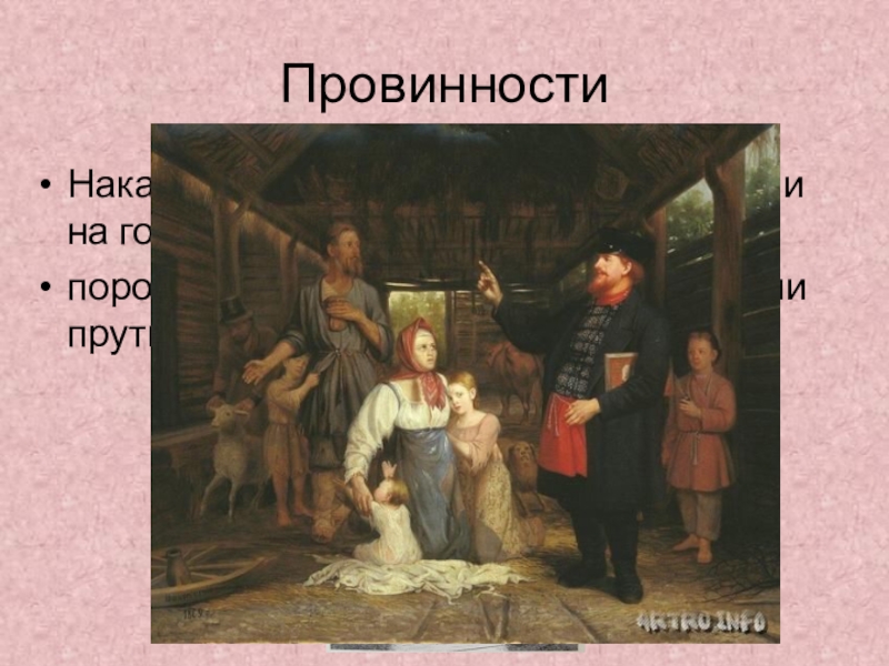 ПровинностиНаказывали – ставили голыми коленями на горох,пороли крапивой или розгами – ивовыми прутьями, вымоченными в воде.