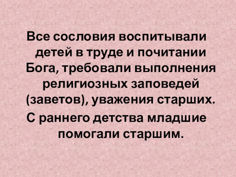 Слайд 9Все сословия воспитывали детей в труде и почитании Бога, требовали выполнения