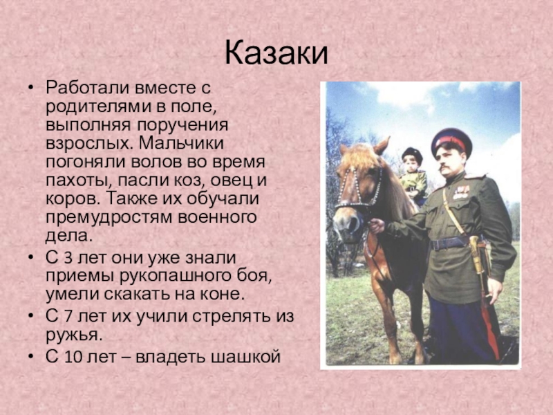 Казаки Работали вместе с родителями в поле, выполняя поручения взрослых. Мальчики погоняли волов во время пахоты, пасли