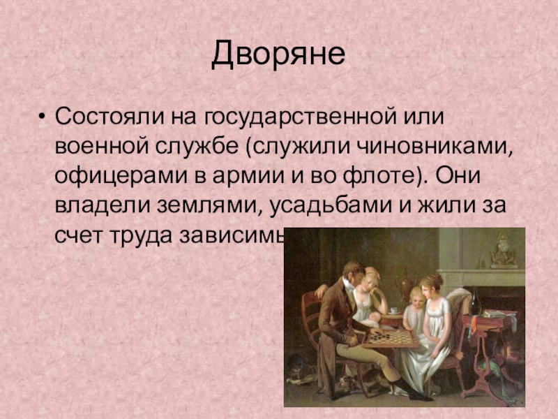 ДворянеСостояли на государственной или военной службе (служили чиновниками, офицерами в армии и во флоте). Они владели землями,