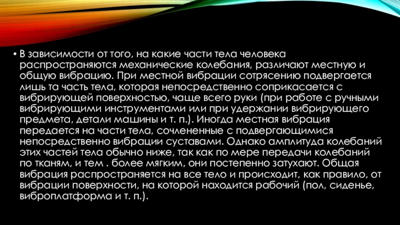 Слайд 7Колебания, передаваемые от вибрирующей поверхности телу человека, вызывают раздражение многочисленных нервных