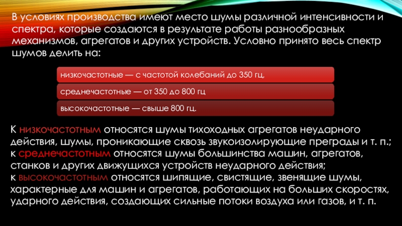 К низкочастотным относятся шумы тихоходных агрегатов неударного действия, шумы, проникающие сквозь звукоизолирующие преграды и т. п.; к среднечастотным относятся шумы большинства машин, агрегатов, станков и других движущихся устройств неударного действия;
