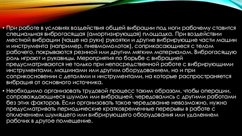 Слайд 10При работе в условиях воздействия общей вибрации под ноги рабочему ставится