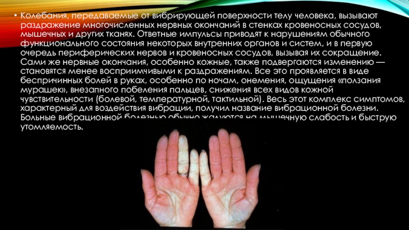 окончаний в стенках кровеносных сосудов, мышечных и других тканях. Ответные импульсы приводят к нарушениям обычного функционального состояния некоторых внутренних органов и систем, и в первую очередь периферических нервов и кровеносных сосудов, вызывая их сокращение. Сами же нервные окончания, особенно кожные, также подвергаются изменению — становятся менее восприимчивыми к раздражениям. Все это проявляется в виде беспричинных болей в руках, особенно по ночам, онемения, ощущения «ползания мурашек», внезапного побеления пальцев, снижения всех видов кожной чувствительности (болевой, температурной, тактильной). Весь этот комплекс симптомов, характерный для воздействия вибрации, получил название вибрационной болезни. Больные вибрационной болезнью обычно жалуются на мышечную слабость и быструю утомляемость.
