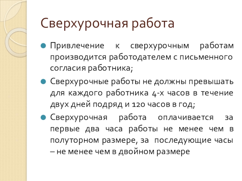 Сверхурочная работаПривлечение к сверхурочным работам производится работодателем с письменного согласия работника;Сверхурочные работы не должны превышать для каждого