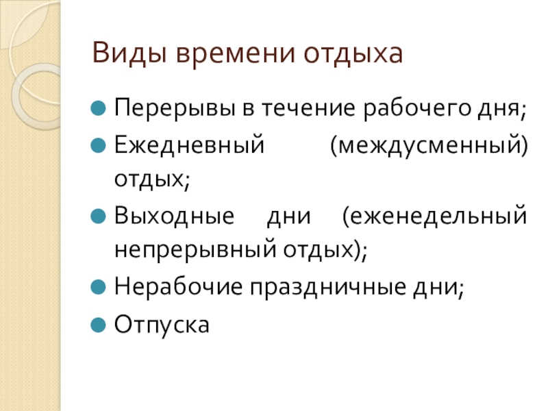 Время отдыха- время, в течение которого работник свободен от исполнения трудовых обязанностей и которое он может использовать