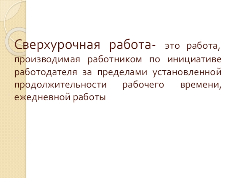Слайд 4Сверхурочная работа- это работа, производимая работником по инициативе работодателя за пределами
