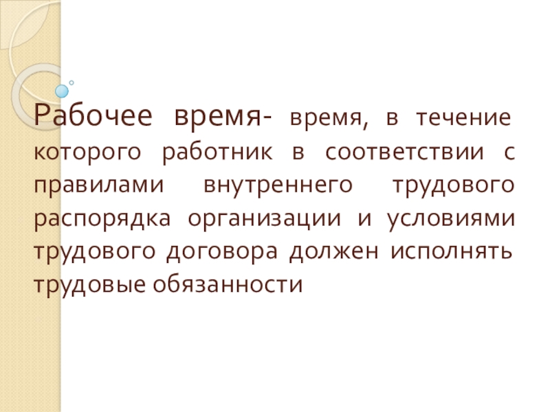 Рабочее время- время, в течение которого работник в соответствии с правилами внутреннего трудового распорядка организации и условиями трудового договора должен исполнять трудовые обязанности