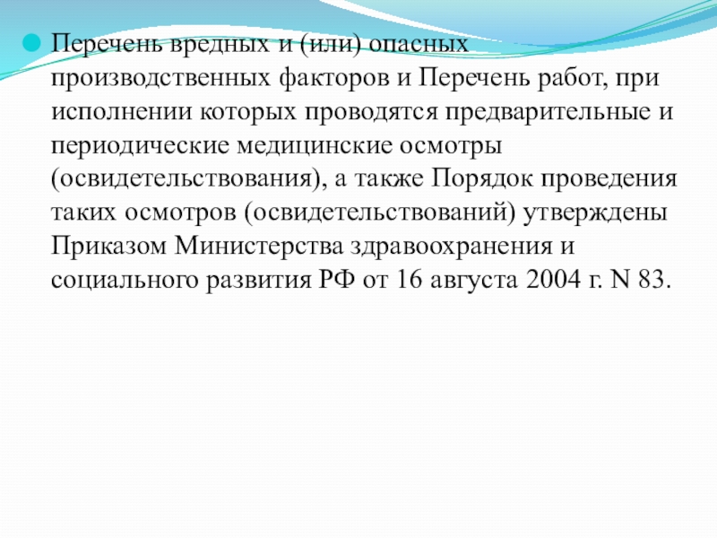 исполнении которых проводятся предварительные и периодические медицинские осмотры (освидетельствования), а также Порядок проведения таких осмотров (освидетельствований) утверждены Приказом Министерства здравоохранения и социального развития РФ от 16 августа 2004 г. N 83.