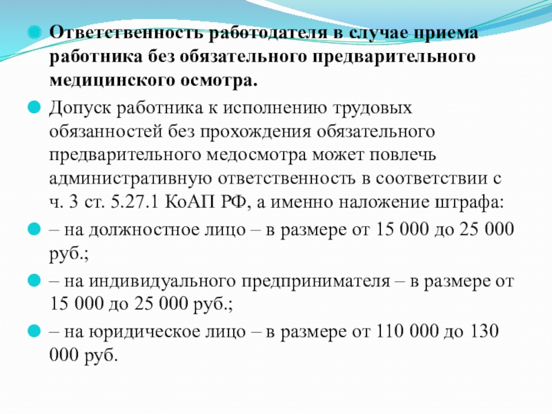 Слайд 14Ответственность работодателя в случае приема работника без обязательного предварительного медицинского осмотра.
