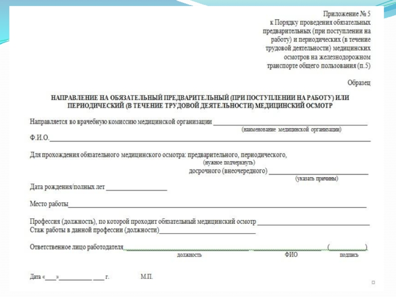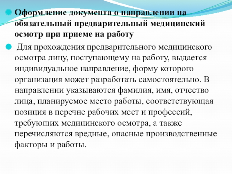 Слайд 15Оформление документа о направлении на обязательный предварительный медицинский осмотр при приеме