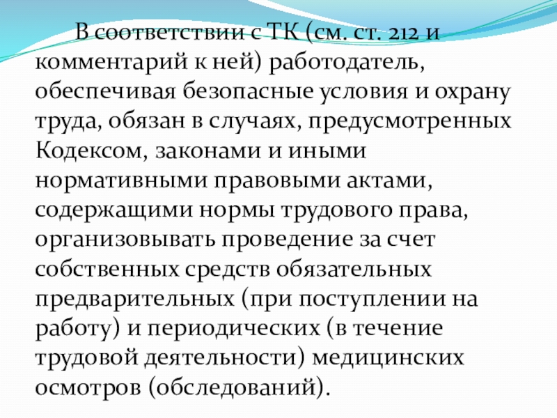 ней) работодатель, обеспечивая безопасные условия и охрану труда, обязан в случаях, предусмотренных Кодексом, законами и иными нормативными правовыми актами, содержащими нормы трудового права, организовывать проведение за счет собственных средств обязательных предварительных (при поступлении на работу) и периодических (в течение трудовой деятельности) медицинских осмотров (обследований).