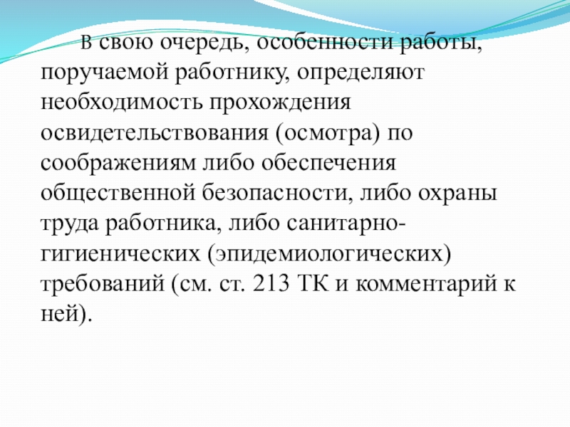 прохождения освидетельствования (осмотра) по соображениям либо обеспечения общественной безопасности, либо охраны труда работника, либо санитарно-гигиенических (эпидемиологических) требований (см. ст. 213 ТК и комментарий к ней).