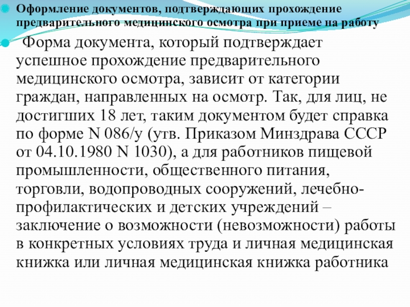 Форма документа, который подтверждает успешное прохождение предварительного медицинского осмотра, зависит от категории граждан, направленных на осмотр. Так, для лиц, не достигших 18 лет, таким документом будет справка по форме N 086/у (утв. Приказом Минздрава СССР от 04.10.1980 N 1030), а для работников пищевой промышленности, общественного питания, торговли, водопроводных сооружений, лечебно-профилактических и детских учреждений – заключение о возможности (невозможности) работы в конкретных условиях труда и личная медицинская книжка или личная медицинская книжка работника
