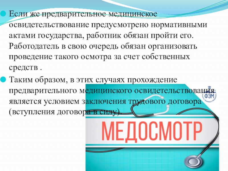 Слайд 6Если же предварительное медицинское освидетельствование предусмотрено нормативными актами государства, работник обязан
