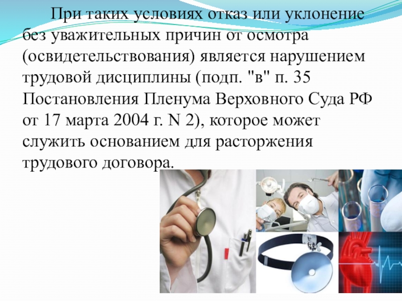 осмотра (освидетельствования) является нарушением трудовой дисциплины (подп. "в" п. 35 Постановления Пленума Верховного Суда РФ от 17 марта 2004 г. N 2), которое может служить основанием для расторжения трудового договора.