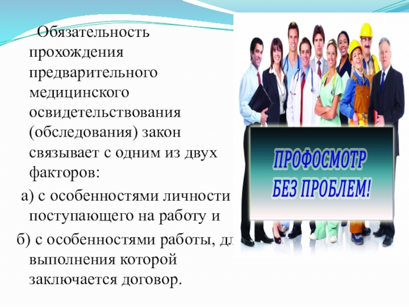 Слайд 7 Обязательность прохождения предварительного медицинского освидетельствования (обследования) закон связывает с одним