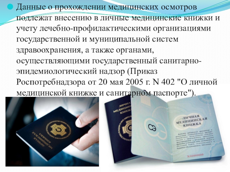 Слайд 13Данные о прохождении медицинских осмотров подлежат внесению в личные медицинские книжки