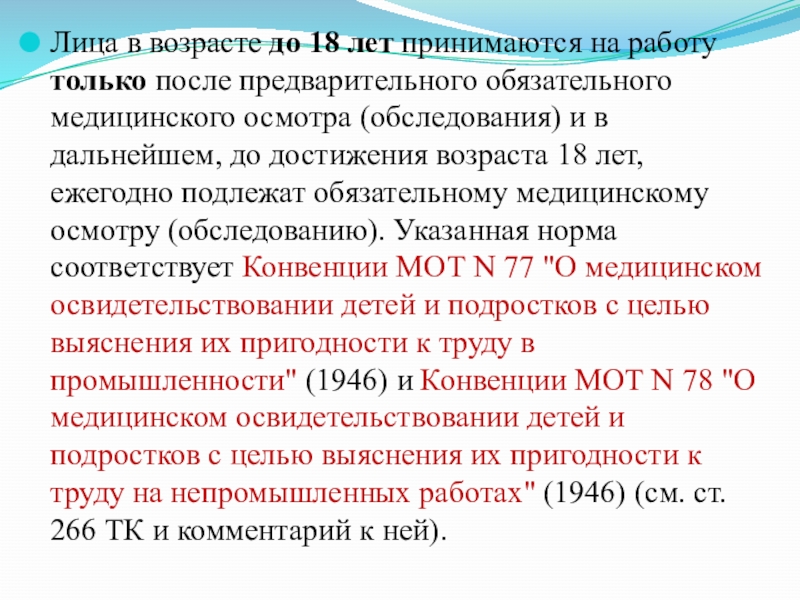 предварительного обязательного медицинского осмотра (обследования) и в дальнейшем, до достижения возраста 18 лет, ежегодно подлежат обязательному медицинскому осмотру (обследованию). Указанная норма соответствует Конвенции МОТ N 77 "О медицинском освидетельствовании детей и подростков с целью выяснения их пригодности к труду в промышленности" (1946) и Конвенции МОТ N 78 "О медицинском освидетельствовании детей и подростков с целью выяснения их пригодности к труду на непромышленных работах" (1946) (см. ст. 266 ТК и комментарий к ней).