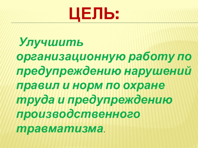 Цель: Улучшить организационную работу по предупреждению нарушений правил и норм по охране труда и предупреждению производственного травматизма.