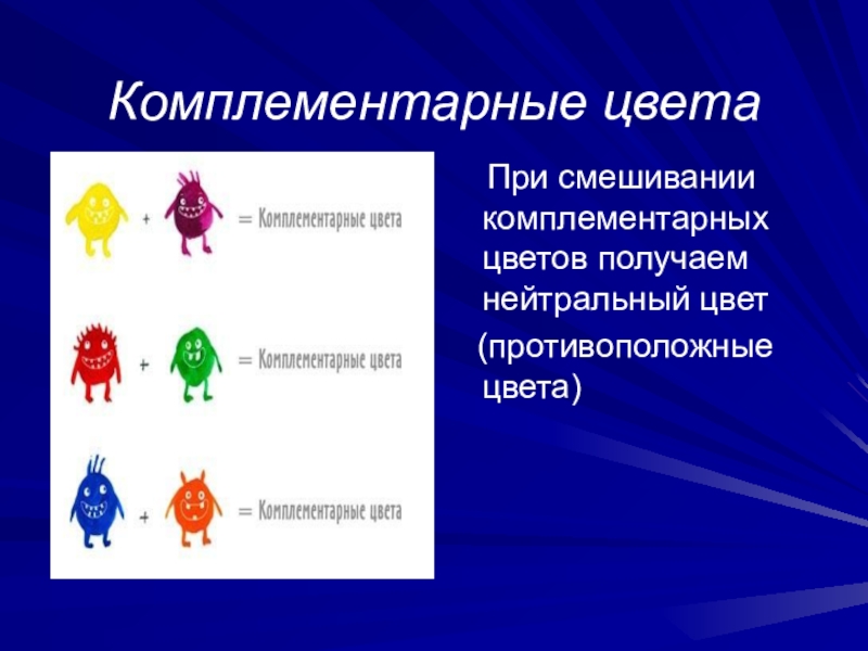 Комплементарные цвета  При смешивании комплементарных цветов получаем нейтральный цвет  (противоположные цвета)