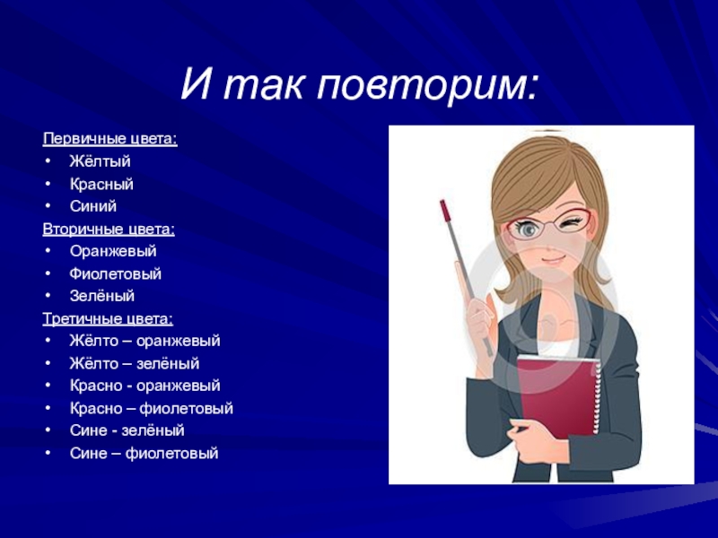 И так повторим:Первичные цвета:ЖёлтыйКрасный Синий Вторичные цвета:ОранжевыйФиолетовый Зелёный Третичные цвета:Жёлто – оранжевыйЖёлто – зелёныйКрасно - оранжевыйКрасно –