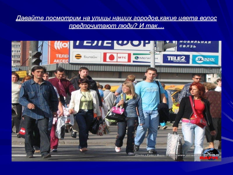 Слайд 2Давайте посмотрим на улицы наших городов,какие цвета волос предпочитают люди? И
