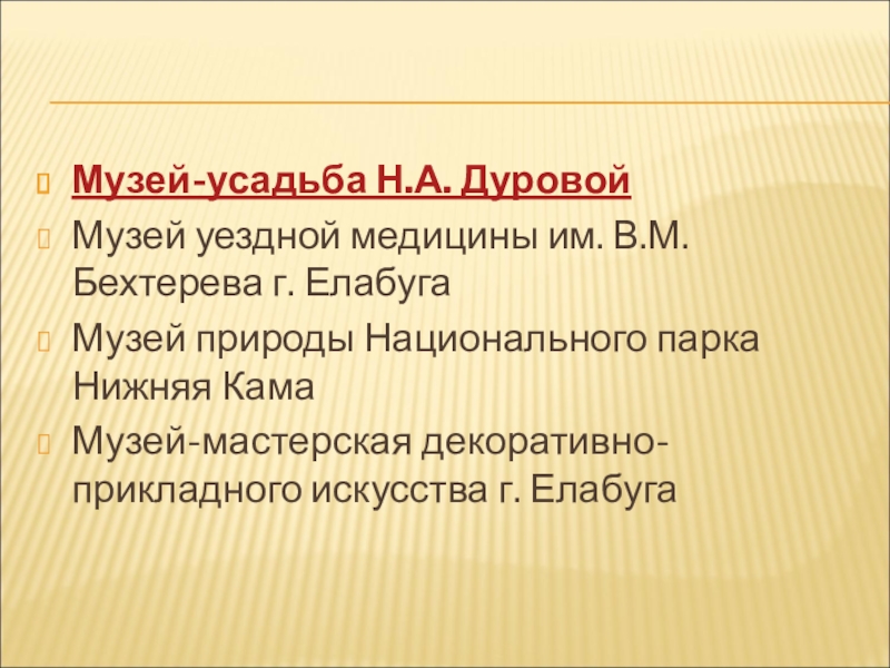 Музей-усадьба Н.А. ДуровойМузей уездной медицины им. В.М. Бехтерева г. ЕлабугаМузей природы Национального парка Нижняя КамаМузей-мастерская декоративно-прикладного искусства