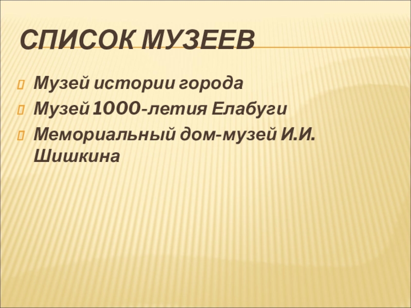 СПИСОК МУЗЕЕВМузей истории городаМузей 1000-летия ЕлабугиМемориальный дом-музей И.И. Шишкина