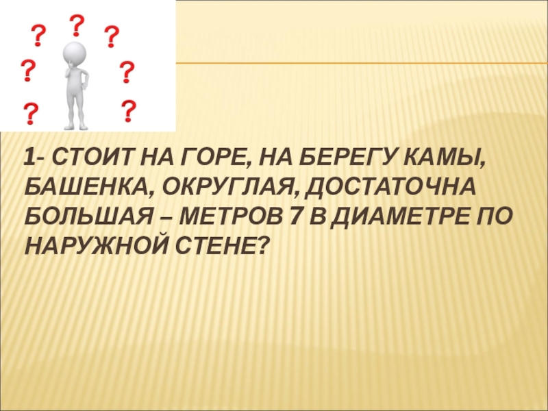 Слайд 2 1- СТОИТ НА ГОРЕ, НА БЕРЕГУ КАМЫ, БАШЕНКА, ОКРУГЛАЯ, ДОСТАТОЧНА БОЛЬШАЯ