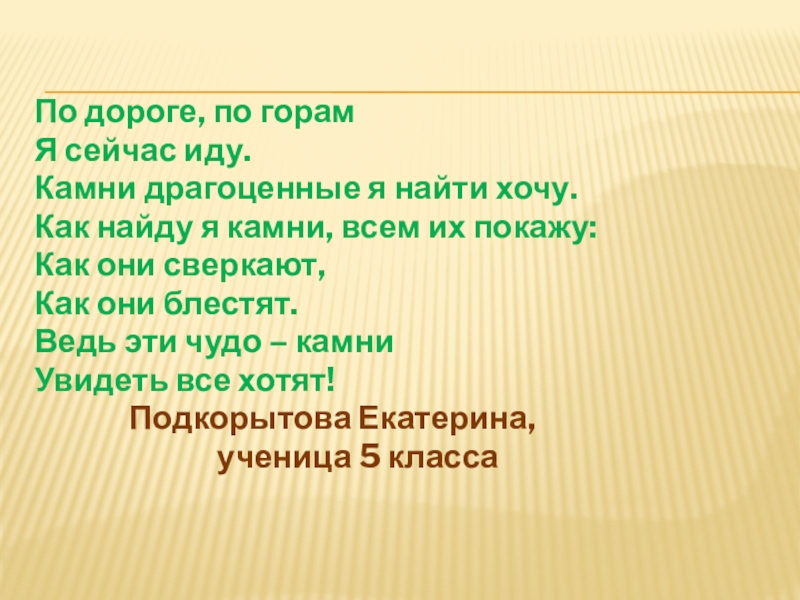 По дороге, по горам Я сейчас иду.Камни драгоценные я найти хочу.Как найду я камни, всем их