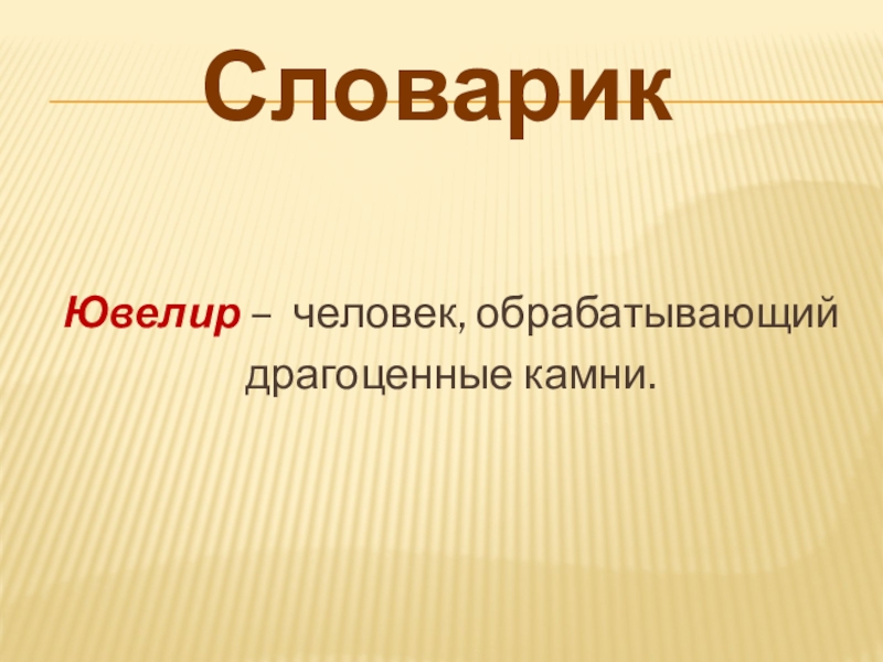 Словарик Ювелир – человек, обрабатывающийдрагоценные камни.