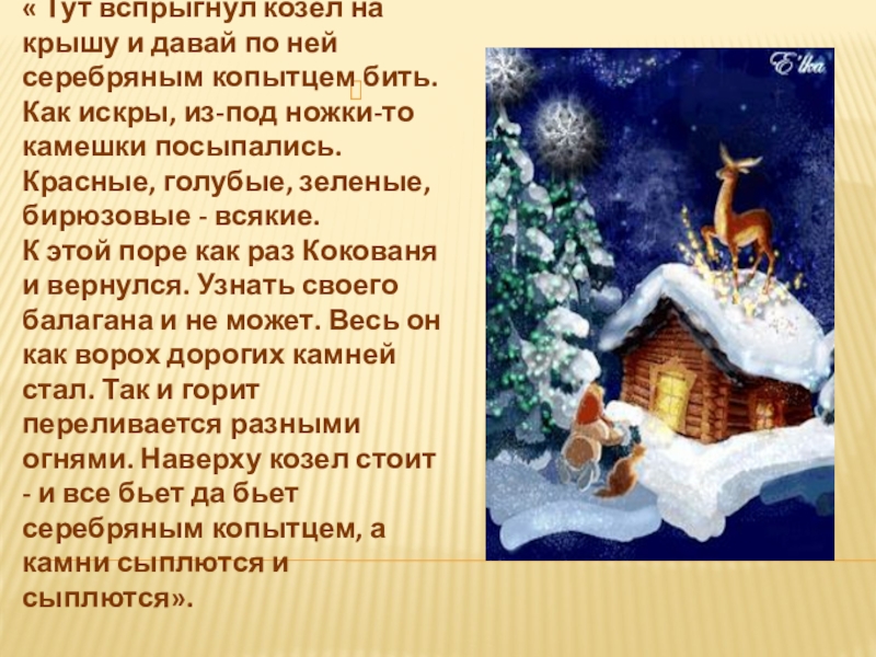 « Тут вспрыгнул козел на крышу и давай по ней серебряным копытцем бить. Как искры, из-под ножки-то камешки посыпались. Красные, голубые, зеленые, бирюзовые - всякие.К этой поре как раз Кокованя и вернулся. Узнать