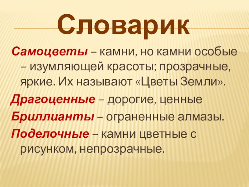 СловарикСамоцветы – камни, но камни особые – изумляющей красоты; прозрачные, яркие. Их называют
