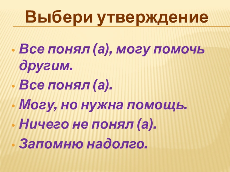 Выбери утверждениеВсе понял (а), могу помочь другим.Все понял (а).Могу, но нужна помощь.Ничего не понял (а).Запомню надолго.