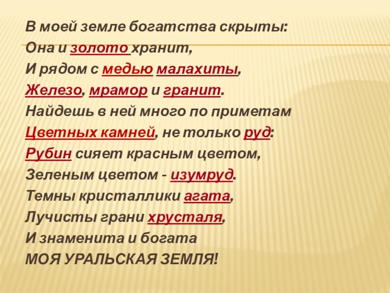 В моей земле богатства скрыты:Она и золото хранит,И рядом с медью малахиты,Железо, мрамор и гранит.Найдешь в ней