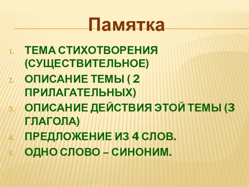 ПамяткаТема стихотворения (Существительное)Описание темы ( 2 прилагательных)Описание действия этой темы (3 глагола)Предложение из 4 слов.Одно слово –