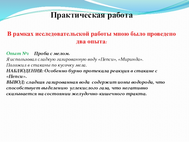ВЫВОД: сладкая газированная вода содержит ионы водорода, что способствует выделению углекислого газа, что негативно сказывается на состоянии желудочно-кишечного тракта.