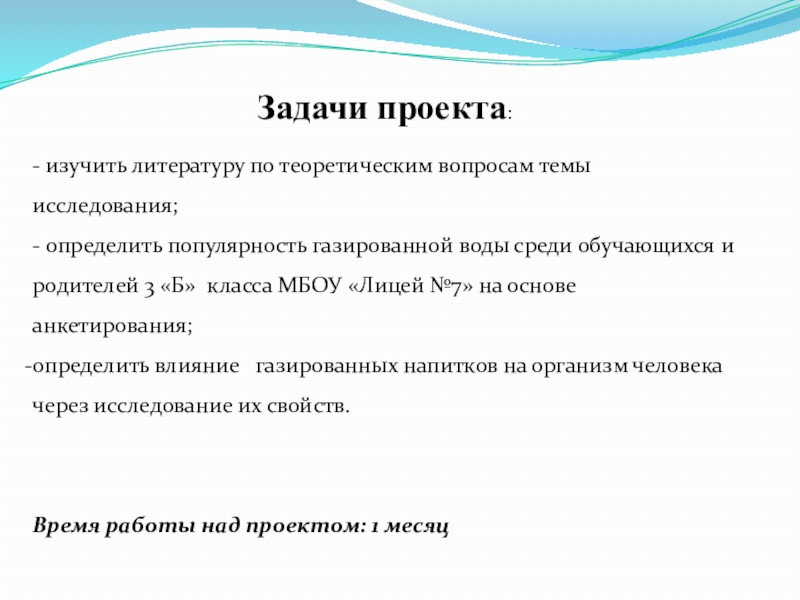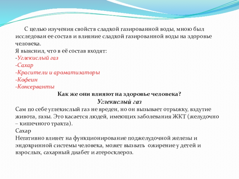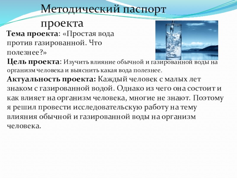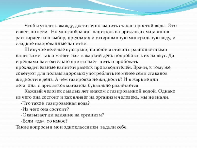 Актуальность проекта: Каждый человек с малых лет знаком с газированной водой. Однако из чего она состоит и как влияет на организм человека, многие не знают. Поэтому я решил провести исследовательскую работу на тему влияния обычной и газированной воды на организм человека.