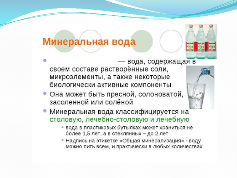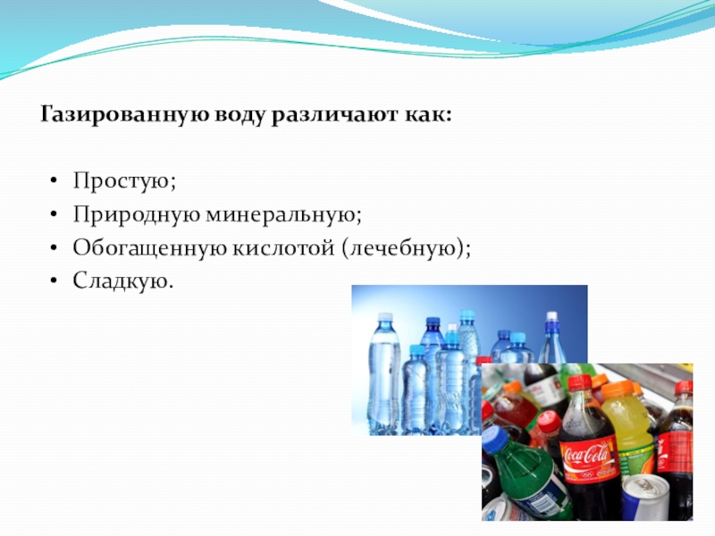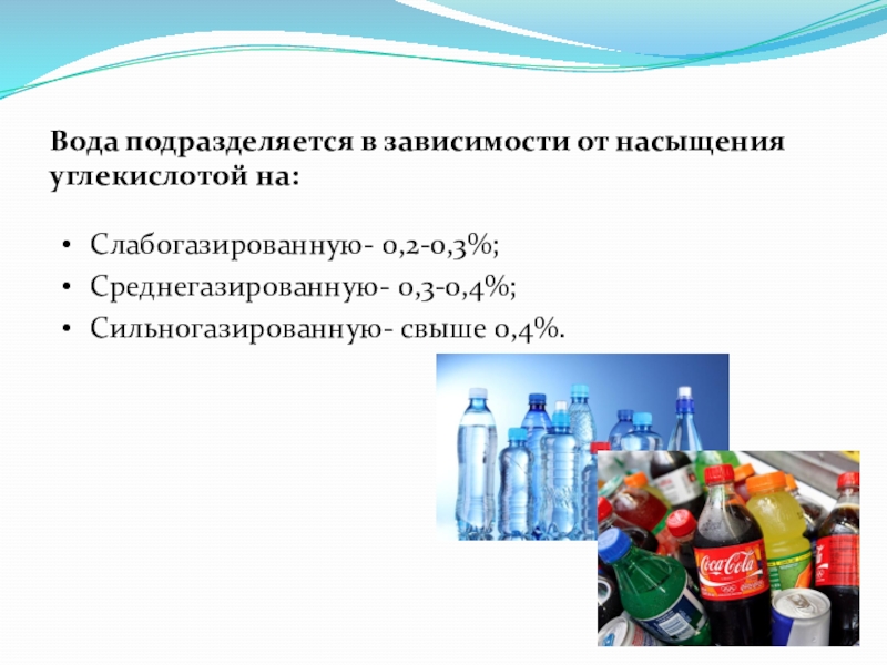Слайд 14Вода подразделяется в зависимости от насыщения углекислотой на: