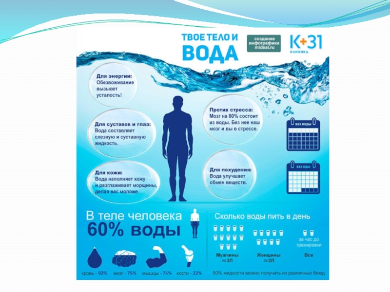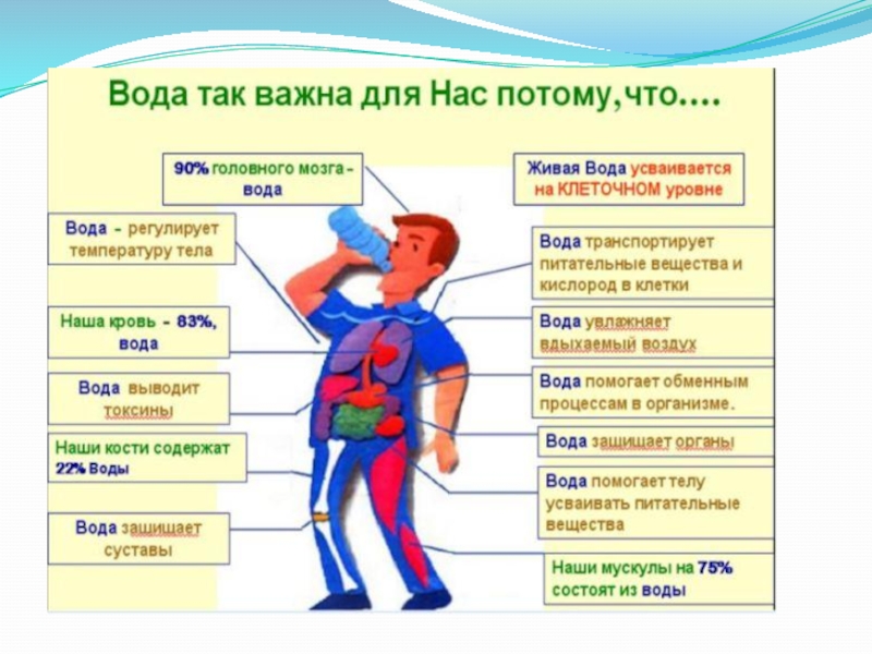 Главный потребитель воды на Земле- это человек. Тело взрослого человека содержит 65%. Без неё человек, например, мог бы прожить не более 2-3 дней, без питательных же веществ он может жить несколько недель. Для обеспечения нормального существования, человек в норме должен потреблять около 2-х литров в день ( это около 60-ти литров в месяц). Именно вода доставляет каждой клеточке нашего организма кислород и питательные вещества. Благодаря воде наш организм может регулировать температуру тела. А ещё вода выводит шлаки и отходы из организма. И это далеко не все полезные свойства воды.