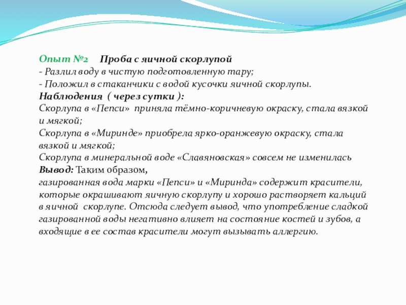 газированная вода марки «Пепси» и «Миринда» содержит красители, которые окрашивают яичную скорлупу и хорошо растворяет кальций в яичной скорлупе. Отсюда следует вывод, что употребление сладкой газированной воды негативно влияет на состояние костей и зубов, а входящие в ее состав красители могут вызывать аллергию.