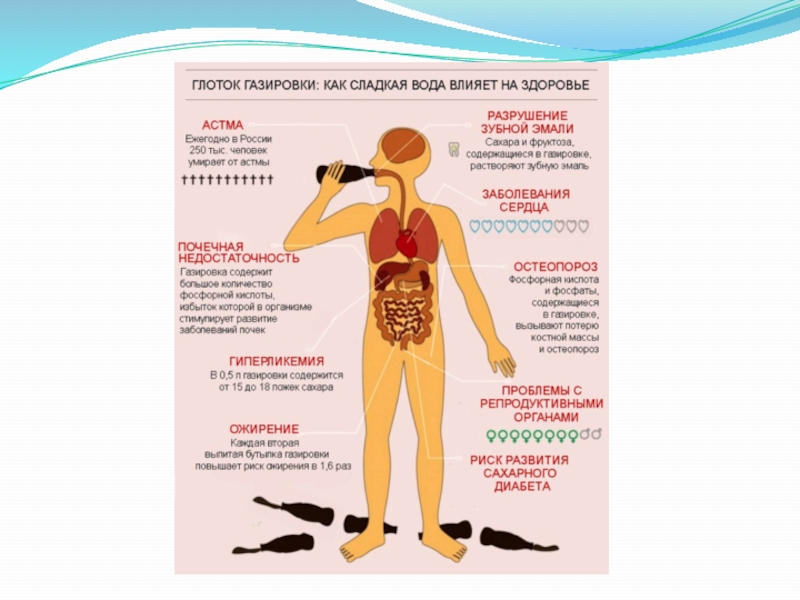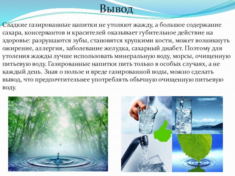 и красителей оказывает губительное действие на здоровье: разрушаются зубы, становятся хрупкими кости, может возникнуть ожирение, аллергия, заболевание желудка, сахарный диабет. Поэтому для утоления жажды лучше использовать минеральную воду, морсы, очищенную питьевую воду. Газированные напитки пить только в особых случаях, а не каждый день. Зная о пользе и вреде газированной воды, можно сделать вывод, что предпочтительнее употреблять обычную очищенную питьевую воду.