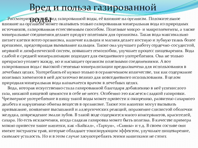 воды, её влияние на организм. Положительное влияние на организм может оказывать только газированная минеральная вода из природных источников, газированная естественным способом. Полезные микро- и макроэлементы, а также минеральные соединения делают продукт полезным для организма. Такая вода максимально питает клетки всего организма, наличие кальция и магния делает костную и зубную ткань более крепкими, предотвращая вымывание кальция. Также она улучшает работу сердечно-сосудистой, нервной и лимфатической систем, повышает гемоглобин, улучшает процесс пищеварения. Вода слабой и средней минерализации подходит для ежедневного употребления. Она не только прекрасно утоляет жажду, но и насыщает организм полезными соединениями. А вот газированная вода с высокой степенью минерализации предназначена для использования в лечебных целях. Употреблять её нужно только в ограниченном количестве, так как содержание полезных элементов в ней достаточно велико для повседневного использования. В целом природная минеральная вода назначается врачом в лечебных целях.