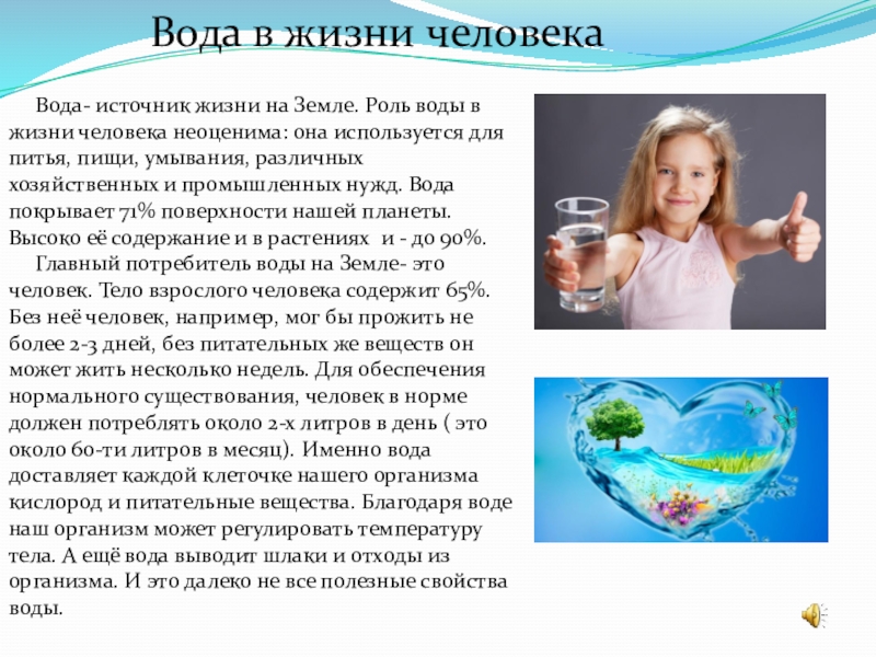 Роль воды в жизни человека неоценима: она используется для питья, пищи, умывания, различных хозяйственных и промышленных нужд. Вода покрывает 71% поверхности нашей планеты. Высоко её содержание и в растениях и - до 90%.