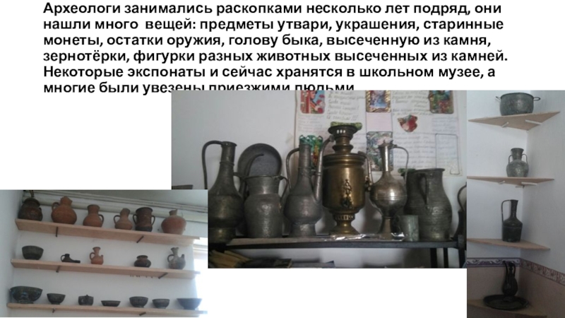 утвари, украшения, старинные монеты, остатки оружия, голову быка, высеченную из камня, зернотёрки, фигурки разных животных высеченных из камней. Некоторые экспонаты и сейчас хранятся в школьном музее, а многие были увезены приезжими людьми.
